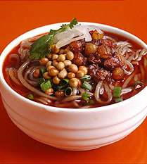 酸辣粉的特点是麻、辣、鲜、香、酸且油而不腻。起源于四川民间,取食材至当地手工制作的红薯粉,味以突出酸辣为主而得名,后来经过不断演变和调制正式走上街头,成为当下最流行的特色小吃之一。